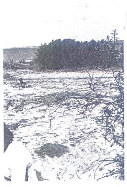 The primary focus of the Hatteras Island survey and tests was to determine whether or not the Cape Creek site (31DRI) at Buxton (Figure 14, upper) was sufficiently intact to support excavations. The site has been traditionally considered the location of the capital town of Croatan, and thus figured prominently in English-Algonkian relations during the 1584-87 period. A surface survey of a recently cleared area of the site collected numerous specimens of ceramics (almost exclusively Colington) and bones, much the same as the earlier collection by Haag (1958). In the cleared area, a section has been graded and a septic tank installed, presumably for a house, and some graded soil has been pushed up into a second terrace above the house site (Figure 14. lower left). Underneath this second terrace, shovel tests revealed a 20-30 cm. midden still intact (Figure 14, lower right), and every indication points two a large section of the site undisturbed under the dunes beyond the clearing. Site 31DR25, a southern extension of the Cape Creek site, was densely covered with maritime forest and undergrowth, and there was insufficient field time remaining to clear and test. Local informants report that shell midden areas of the site still exist, however.