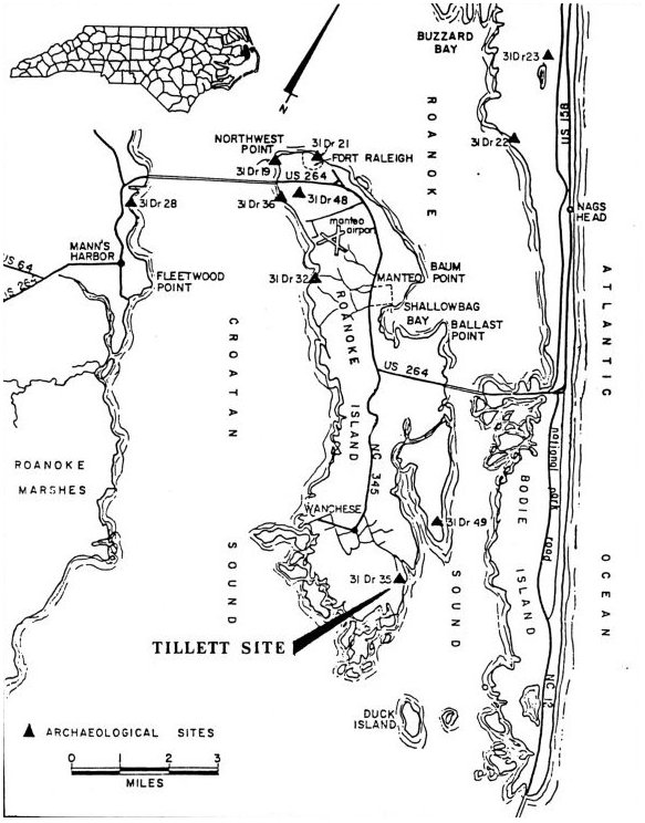 The Tillett site is also interwoven with other aspects of Roanoke Island history. The last Native American inhabitants of the site were probably members of the Carolina Algonkian Roanoke society, the same people whom the first English explorers visited on Roanoke Island in 1584. The Roanokes also figured prominently in relations with the English colonies of 1585 and 1587 established near what is now Fort Raleigh on the north end of the island. When the first museum was completed at Fort Raleigh it was artifacts and other material excavated from the Tillett site that were installed in the displays typifying the Carolina Algonkian culture. It is thus appropriate that the site be recognized for its contributions to knowledge of 16th century and earlier Native American culture during America's Four Hundredth Anniversary celebration.