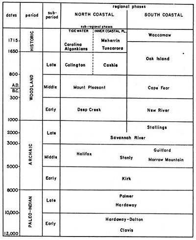 While no detailed study of the Wanchese locality on the south end of Roanoke Island has yet been accomplished, information from local informants and preliminary studies of local collections obtained in and around Wanchese indicate occupations during the entire Archaic period, 8000-1000 B.C. (Table 1). Archaic period evidence has also been found at other sites (31DR36, 49) on the island (phelps 1977: 61-62). During that time the island was still connected to the mainland, and only after sealevel had risen sufficiently to create the island and form partly saline sounds was the way of life observed at the Tillett site possible.