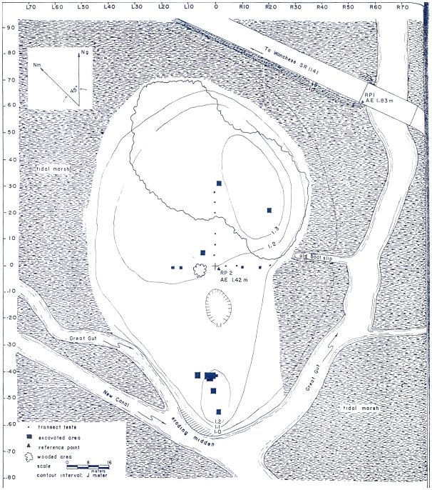 A grid orientation was selected that best suited the generally oval site surface area with the north-south baseline along the long axis of the oval. Grid-north was set at N 45o E to magnetic north and the baselines were cleared and staked (Figure 4b). The only closely adjacent point of known elevation was the bridge carrying S.R. 1141 over Great Gut, and its deck elevation was obtained from the Department of Transportation Bridge Maintenance Division in Elizabeth City. Our reference point 1 was a stake driven even with bridge deck elevation at the northwest end of the bridge (Figure 3). From this, a second reference point (2) was established near grid center to facilitate readings on the site and topographic mapping of the site was accomplished. Elevations were taken as depth controls in excavated units and twice daily readings of the water level in Great Gut were recorded to provide site water level correlations and the effect of wind tides in the stream. (Page 13)