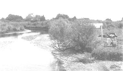 The site is a few meters west of State Road 1141 and its southern end is defined by a U-bend of Great Gut (Figures 2b, 3). Great Gut is variously referred to as a "canal" and a "stream"; in reality it is the latter, and is, more precisely, a small creek. Its form and course suggest an origin carrying run-off from the higher ridge, but as sealevel rose and the marsh encroached, it now also drains the wetlands. Since Great Gut has also served as a traditional access waterway to the southern margin of Wanchese, it has certainly experienced some maintenance of its channel, thus the possible origin of the "canal" designation. The new canal shown in Figure 3 is one of a series of waterways cut through the southern marshes in the 1950's for purposes of mosquito control. It intersects Great Gut at the southern tip of the Tillett site, and is now the main channel from the south side to Roanoke Sound. Boat traffic has abandoned Great Gut from the site eastward to Roanoke Sound and the channel in that section is silted and shallow. In former times, when the Tillett site was actively occupied, Great Gut or a stream ancestral to it probably served as the main access to Roanoke Sound.