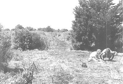 On-site work began with clearing paths through the head-high consumption weeds on the site to determine its surface extent and obtain a collection of specimens. This proved to be practically useless for specimen collection, but did permit a visual estimate of the distribution of shell midden debris. After cutting an entry path and clearing a central area for tool storage, radial and peripheral lines were cleared to expose a sample of the surface. These paths can be seen in Figure 2b. From the exposure afforded by the clearing, the extent of midden debris on the surface was roughly plotted and directions for the grid baselines selected. Even with the clearing, surface visibility was improved to approximately ten percent, about seven percent greater than it had been in 1972. The combined total collection of artifacts, predominantly ceramic sherds, from 1972 and 1979 numbers 172 specimens, not including some fragmentary animal bones. Part of the 1979 collection was obtained from the eroding shell midden area along Great Gut (Figures 3, 4a) so the actual upland surface total is very small for a site of this size.