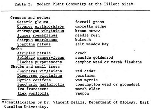 Modern vegetation on the site in 1979 is summarized in Table 2. The lone maritime forest on the northeast elevation was primarily red cedar, yaupon and wax myrtle with a few persimmon trees. Isolated red cedars stood in the central and southern areas of the site (Figure 2b), but most of the area was covered with a head-high growth of consumption weed interspersed with wax myrtle and other plants. The surrounding marsh contained needle rush and salt meadow hay in a normal successional sequence as well as other wetland species.