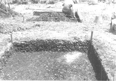 Three features in squares -42, -42L2 and extension -41.5R1 of the -42 trench (Figure 10) were not excavated because of lack of time. The shell and organic fill of these pits was plotted in outline at the top of the Zone III sand in the last few days of field work which were necessarily spent excavating burials and back-filling the site. (Page 28)