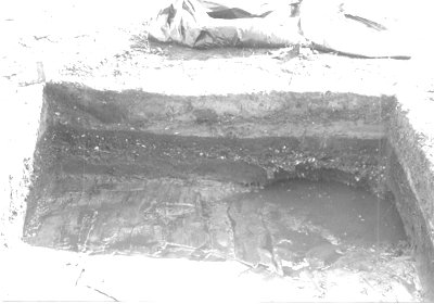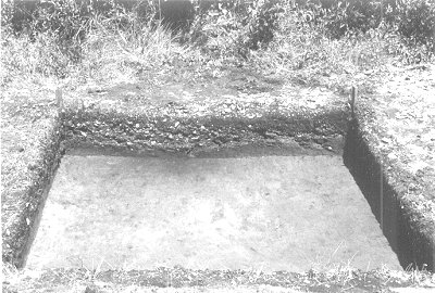 There are three potential sources of origin for this feature with mixed soil fill, which was the result of previous excavations at the Tillett site. The outline, that of a regular-sized excavation (Figure 10), was first observed at 20 centimeters below the surface, the depth to which the southern part of square -42L2 had been disturbed by grading and other activities. Eventually, the former excavation was exposed in extension square -43L2, where it had intruded into the western side of the Burial 2 pit (Figure 11b). Our first interpretation was that this was our own 1972 test square A, a 2-meter unit, but the exposed outline, when hypothetically extended, appeared to exceed a unit of that size. The second source could have been the excavation carried out by Paul Green and Ben Dixon MacNeill in 1938, and the third might have resulted from Talcott Williams' (1896:54) visit, although it is doubtful that he opened any excavations at this site.