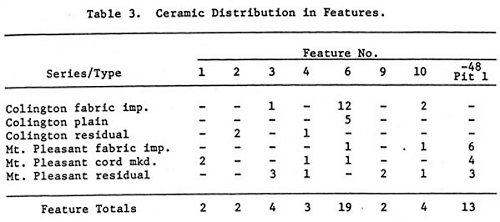 Similar to Features 1 and 2, the generally oval part of the outline of Feature 3 was exposed in the northwest corner of square -56R2 at a depth of 20 centimeters. The pit fill was a dark, organic soil containing oyster shells and fringe areas of yellow sand at the periphery. Besides the shells and a few faunal specimens, the pit contained one Colington fabric impressed and three Mount Pleasant residual ceramic sherds (Table 3) and bottomed at a depth of 10 centimeters. It, too, probably resulted from deeper mechanical disturbance in this corner of the square.