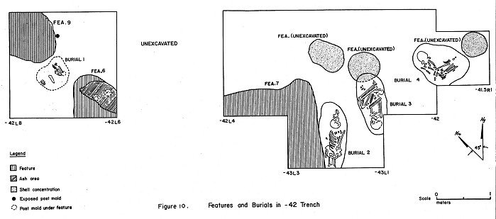 Four human burials were recovered from the Tillett site during the 1979 excavations. The first was the bottom remnant of a burial pit in square -42L6 extensively disturbed by ground leveling activity on the site, but three others in the -42 trench and its extensions were relatively intact although the bones were in poor condition from immersion in salt water (see Figure 12b, d). In a situation that seems all too frequent in archaeological projects, the three intact burials were exposed during the final two days of field work, requiring an extra effort by the crew to remove them and complete back-filling of the site. Location of the four burials is shown in Figure 10, in relation to other features in the -42 trench area. Appendix A contains the osteological description and analysis.