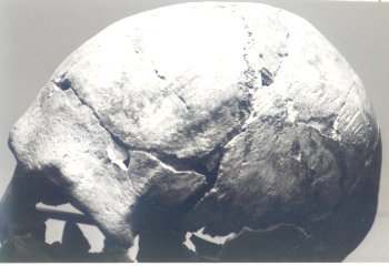 After death, the individual had been prepared for burial by removal of the skin and all soft parts of the body, and had probably been stored or kept out of the ground for a time sufficient to permit some deterioriation of the cartilaginous connective tissues. Scraping, or "fleshing", marks observed on the frontal and left parietal bones of the cranium (Figure 11d) have the characteristic linear gouges into the compact bone surface made by a tool with a serrated edge. The vertebral column was still articulated with ribs, left scapula and arm in normal anatomical positions, and partially overlay the disarticulated leg bones; over these, the disarticulated parts of the pelvic girdle (innominates and sacrum) had been placed; the cranium was deposited adjacent to the cervical vertebrae at the northeast end of the burial but in reverse of its normal anatomical orientation; the mandible lay in front of the face and the long bones of the right arm were below the eastern side of the skeleton. All of the bones were in (Page 32) poor condition from intermittent immersion in salt water. Colington ceramics in the pit fill (Table 4) place the burial in that component.