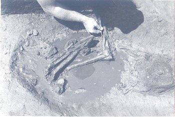 Burial 3 contained the semi-flexed inhumation of an adult female (see Appendix A). The burial pit, first observed at the top of the Zone III sand (Figure 11a), was oval-shaped with its main axis oriented northeast-southwest, and measured 1.2 meters by 50 cm. The individual was placed in the pit on her left side, facing northwest,.with the cranium at the southwestern end of the pit. The left arm was tightly flexed against the body with the hand below the chin, while the lower right arm extended outward across the left with the hand near the knees of the loosely flexed legs (Figure 12c). The pit intruded 20 cm. into the Zone III sand below present sealevel, resulting in poor condition of the bones from constant immersion in salt water (Figure 11b) and required constant pumping and sponging of the pit in order to clean and finally remove the skeleton. The pit was filled with typical midden soil and debris, including Colington ceramic specimens (Table 4) which date the burial to the Colington component.