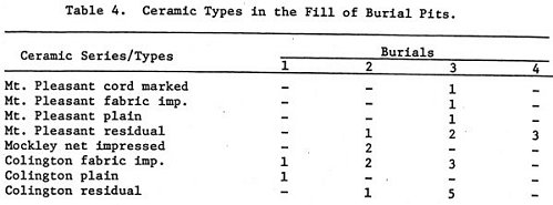 Table 4 lists the ceramic sherds from the fill of the burial pits. Burial 1, which originated and terminated within the shell midden zone, contained only Colington fabric impressed and plain sherds; Burials 2, 3 and 4 also originated in the shell midden but intruded into the sterile sand below the midden. Mount Pleasant, Mockley and Colington series sherds were present in the fill of Burial 2 and the Burial 3 fill contained Mount Pleasant and Colington sherds with the latter series predominant. Only Mount Pleasant ceramics were present in the Burial 4 fill. The ceramic evidence places Burials 1, 2 and 3 in the Colington component, and Burial 4 in the Mount Pleasant component of the site sequence.
