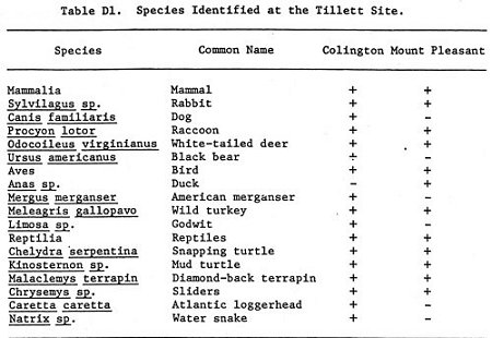 The identifiable species do not provide significant information on seasonality of site occupation. All mammals identified can be found year-round on the North Carolina coastal plain, as can the wild turkey. The American merganser (Mergus merganser) and godwit (Limosa sp.) are found in greatest abundance from October to March though numbers of both species may be found throughout the year.
