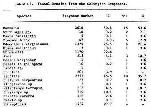 In Table D1 are recorded the non-fish species identified in the two components. A total of 15 genera or species of three classes of vertebrates were identified including five species of mammals, four species of birds, and six species of reptiles. Eight species: rabbit (Sylvilagus sp.), raccoon (Procyon lotor, white-tailed deer (Odocoileus virginianus), wild turkey (Meleagris gallopavo), snapping turtle (Chelydra serpentina), mud turtle (Kinosternon sp.), diamond-back terrapin (Malaclemys terrapin, and sliders and scooters (Chrysemys sp.) were common to the two components.