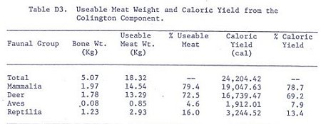 The 15 species of non-fish vertebrates represented in the faunal assemblage of the Colington phase of the Tillett site would have provided 18.32 kg. of useable meat and 24,204.42 calories (Table D3;. Mammils provided 14.54 kg (79.4%) of the useable meat and 19,047.63 (78.7%) of the available calories. Reptiles provided 2.93 kg (16.0%) of the useable meat and 3,244.52 (13.4%) of the available calories.