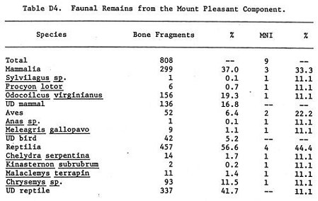 808 bone fragments of nine species of non-fish vertebrates were examined. Mammalian remains accounted for 299 (37.0%) of the bones, three of the identified species, and three of the MNI (Table D4). Although fragments of the white-tailed deer were the most numerous mammalian fragments, only one individual could be definitely identified. Raccoon was represented by six bone fragments. All were post-cranial remains and all exhibited complete epiphyseal closure. Rabbit was represented by one post-cranial fragment and it was completely ossified.