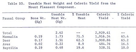 While six (40%) of the 15 identified species are inhabitants of the terrestrial habitat, these animals provided 15.39 kg (84%) of the useable meat and 20,954.64 (86.6%) of the available calories. Cursory examination of these data would suggest intensive exploitation of the terrestrial habitat and minimal utilization of the aquatic environment however, it must be remembered that fish remains were not included in this analysis.