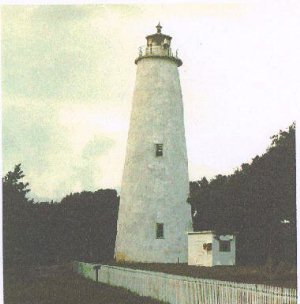 (Courtesy of North Carolina Medical Journal)In 1818 the old Ocracoke Lighthouse, a fifty-five foot high wooden pyramid, was actually on Shell Castle, a privately owned island shaped like a crooked snake, and located just inside Ocracoke Inlet. This Lighthouse was struck by lightning and burned in 1818. The Congress appropriated twenty thousand dollars in 1822 for a new light on Ocracoke Island. The new Ocracoke Lighthouse, sixty-five feet tall to the level of the light, was erected and illuminated in 1823. Keep in mind the U.S. Government owned the hospital at Portsmouth and the Lighthouse on Ocracoke and were under their control.