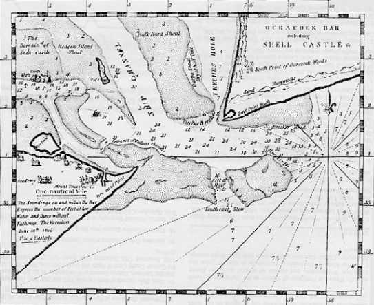 Ocracoke Bar including Shell Castle, by Edmund M. Blunt, NY, 1809Also, in 1842 a Federal building project on the Banks was to better succor sick and disabled mariners. The makeshift hospital started by Customs Collector Taylor had never been satisfactory. The United States Congress appropriated $8,550.00 in 1842 for a new hospital building which was completed in 1847.