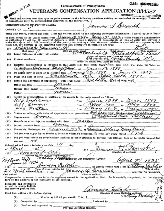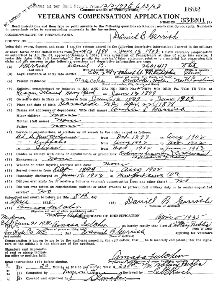 We need your assistance to make this data accurate and complete. If you have information on a veteran from Hyde County who served during the Spanish-American War who isn't listed below, or if you have additional information on any of the veterans on these pages, please let me know. This can include military data, photos of the veteran, especially during their service, stories or their service during the Spanish-American War, etc., or if you have any information on any of Hyde's veterans who were Killed in Action and the circumstances surrounding their deaths, please contact me. Any information you have will contribute to honoring Hyde County's Veterans, living and dead.