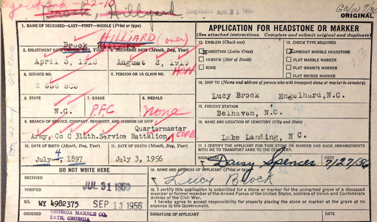 | Brock, Hilliard | July 4, 1897 | July 3, 1956 | North Carolina - Pfc. Co. C - 314 Service Bn. QMC - World War I | |