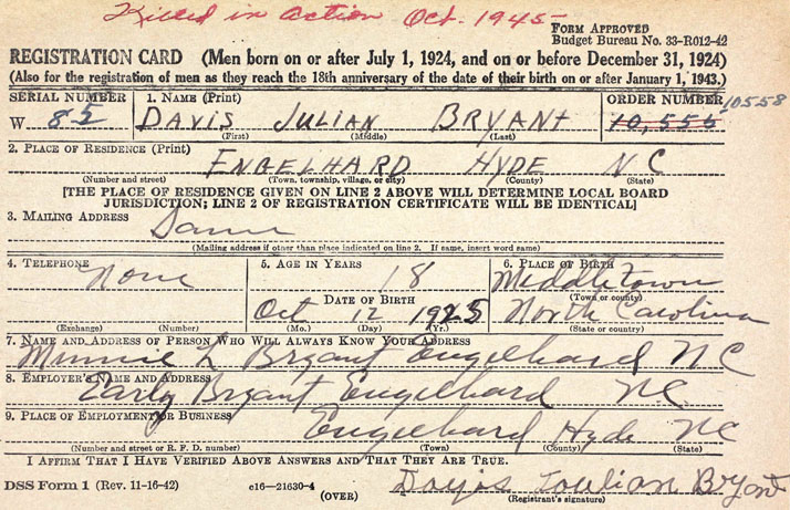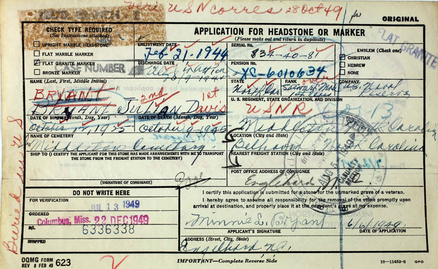 | Bryant, Davis Julian | Oct. 12, 1925 | Oct. 9, 1945 | USNR - Steward's Mate 1st Class - World War II - Killed in Action |
