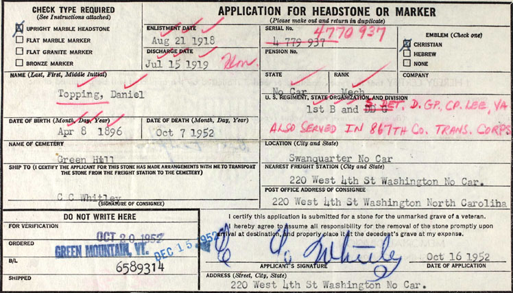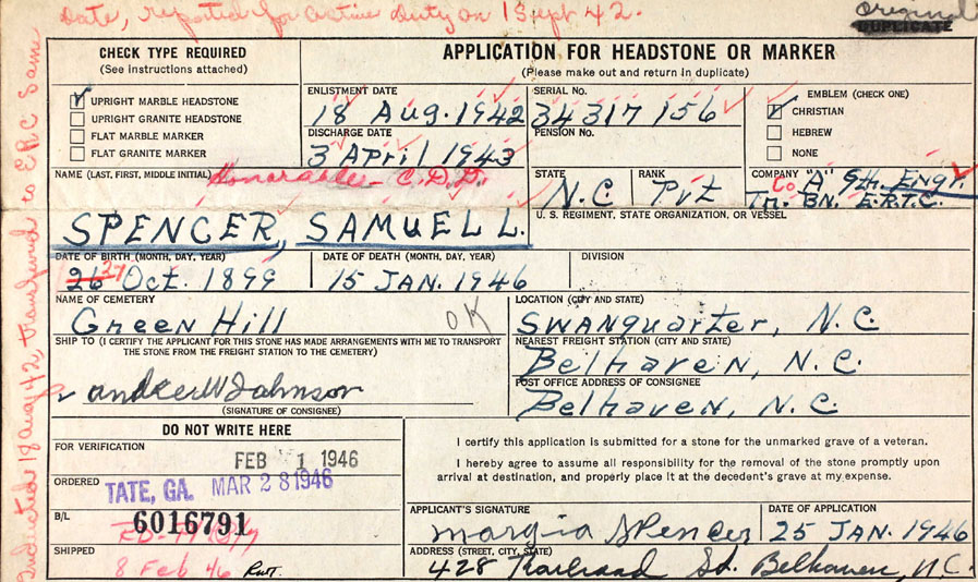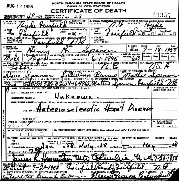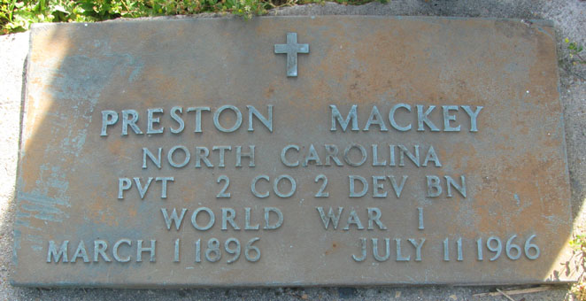 | Spencer, Henry H. | June 1, 1895 | July 18, 1958 | North Carolina - PVT - Co. D -329 Service BN - QMC - World War I |
