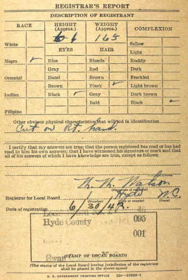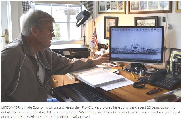 Edward Royden “Roy” Clarke, Jr. of Engelhard, North Carolina is the retired chairman and president of East Carolina Bank. He spent approximately twenty years researching the citizens of Hyde County who served in World War II, ultimately documenting about 95% of them. Clarke also began accumulating personal war biographies on many of the veterans, with hopes of someday writing a book entitled They Came From Hyde. His research was based on personal interviews with the veterans or their family members, military discharge papers, and extensive internet research on all aspects of the history of the war. This collection includes detailed service information related to more than 600 WWII veterans from Hyde County, North Carolina. It comprises his research material on Hyde County’s involvement in World War II, largely consisting of photocopies of personal correspondence, photographs, family papers, newspaper articles, military documents, and extensive descriptions of specific battles and military armaments. A Finder's Aid of Clarke's Papers (1938-2018) was generated by Linda McGowan McQueen in September 2019. Access this site for the veteran names and the Box #. Copies of a veteran's file can be purchased from the Outer Banks History Center in Manteo, NC (252-473-2655) or e-mail at obhc@ncdcr.gov for $.10 per page plus shipping and handling which may run $1-$2 if shipped to your home. The record can also be sent via e-mail to your computer.