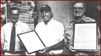 left to right - E. Royden Clarke, Chairman of the Board at East Carolina Bank, presents gifts to Bernard Midgett and George Midgett in honor of their father, P.D. Midgett, who served almost 40 years on the Bank's Board of DirectorsENGELHARD - The children of a long-time member of the East Carolina Bank's Board of Directors were presented a gift recently on behalf of the bank's board in honor of their father. E. Royden CLARKE, Chairman of the Board and Bank President, presented a framed resolution to each of P.D. MIDGETT, JR.'s children to honor their father who died in January. MIDGETT served on the bank's board since 1954. The Board of Directors adopted a page-long resolution which summarized the many contributions of MIDGETT to his community, and it was read at the bank's annual shareholder meeting in late May. MIDGETT, originally from Dare County, brought electricity to much of Hyde County and to mainland Dare County through his Pamlico Power and Light Company for 50 years, beginning in 1935. A former North Carolina senator, he was a leader in a number of community projects in Hyde County, including his influence in securing the road across Lake Mattamuskeet in Hyde County which was completed in 1942. He was one of the founders of the Engelhard Rotary Club in 1935 and was a charter member of the Southern Albemarle Association, organized in 1935. His children are P.D. MIDGETT, III of Southport, George MIDGETT of Denver (near Charlotte), Bernard MIDGETT of Buxton and Martha Midgett KELLY of Newport News. George and Bernard received the framed resolutions on behalf of their family members. (The Coastland Times - July 1995)