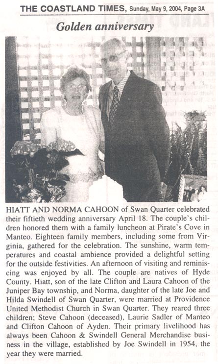 The descendants of James Henry CAHOON held their family reunion on July 11 at J.B. and Bernice CAHOON's home in Engelhard. Nearly 80 people attended the reunion despite the occasional periods of light rain. The speaker for the reunion was James CAHOON of Columbia, who has done extensive research on the CAHOON family and offered some very interesting information on CAHOON ancestors. He also had a CAHOON Coat of Arms done in copper by Delores ROSE of Gum neck. Young and old alike were designated numbers which were drawn, allowing each to choose from a table full of prizes. Plenty of food, good fun and fellowship was had by all. The Cahoon Chronicle II, a family news printout, was available to take home (along with memories) with the family's latest news. Next year's reunion is planned to be held on the second Sunday in July at Jean and Leon BALLANCE's home in the Lake Landing township. (The Coastland Times - July 1999)