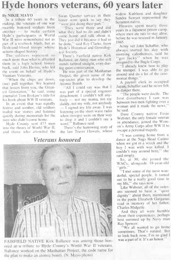 Muzel "Musie" BRYANT celebrated her 100th birthday recently with a community party, social hour, and dinner in the Ocracoke School gym. Musie arrived at the party in grand style, riding in a chauffeur-driven limousine, and was greeted by approximately 300 guests from the Ocracoke community and off-island well-wishers. Host for the gala event was her longtime friend, Kenny BALLANCE, and flowers for the celebration were provided by Chester LYNN of Annabelle's Florist. As the star of the evening, Musie was honored by several guest speakers who remarked on her life and family. They included Mary BRYANT, her niece from Manhattan; Leon BRYANT, a cousin from the mainland and a Hyde County commissioner; Ruthie KING, a friend from Atlantic; and Alton BALLANCE, an Ocracoke friend. On behalf of the Hyde County commissioners BRYANT and Nathan SEARS presented Musie with a plaque and letters and certificates from the offices of Governor Mike EASLEY and state senator Marc BASNIGHT were read. In a nod to her fondness for chocolate candy, Musie received three cases of chocolate bars and a letter of congratulations from Hershey's. Following the dinner and speeches, Musie and her guests continued on to Howard's Pub for a dance with music provided by the Ocracoke Rockers. There, the "birthday girl" celebrated until nearly 2 a.m., outlasting some of her younger companions. despite reaching the century mark, Musie remains active and refuses to let life pass her by. According to Kenny BALLANCE, with whom she has resided since 1997, she loves to read the newspapers and enjoys visiting with her many friends. She also enjoys the company of her cat and watching favorite TV shows. Musie grew up on Ocracoke Island, the second oldest of 13 children born to Leonard and Jane BRYANT. Two of her siblings survive: Annie Laura BARBER,89, of Cross Creek Nursing Home in Swan Quarter, and Mamie BRYANT, 92, of Manhattan. Her grandmother, Winnie BLOUNT, was a slave from the Blounts Creek area of Beaufort County; when freed she came to Ocracoke to live. She and her husband had two daughters, one of whom was Musie's mother. Musie worked in many local home and at the old Pamlico Inn in her younger years; in fact, she continued to work until the age of 90. Her one child, a son Charles, lived in Plymouth until he passed away. According to BALLANCE, even the approach of a hurricane doesn't faze Musie and in her 100 years she has never let a storm drive her from her beloved island. One of her earliest memories as a small child is hearing the older folks of the island talking about "those two fellows trying to get that plane off the ground"---those "fellows", of course, were the Wright brothers. (The Coastland Times - Thursday, April 1, 2004; pg. 1A & 6A)