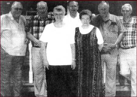 The MIDGETTE siblings recently gathered with various relatives and longtime friends for a buffet dinner in the Ocracoke Community Center. Pictured (front) are Joyce M. SPENCER, and Geneva M. ODOM; (back row from left) Ellis MIDGETTE, Jesse MIDGETTE, Johnny MIDGETTE, Elmer MIDGETTE, and Carnell MIDGETTE. This marked the first time the siblings were all together in 16 years. Along with sister, Janet, who passed away in 1945, they are the children of the late John and Mattie MIDGETTE of Ocracoke Island. (The Coastland Times - Thursday, September 7, 2000; pg. 6B)