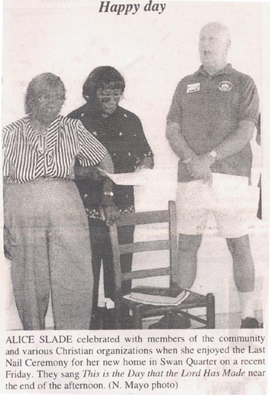 HYDE DAUGHTER CELEBRATES 100th BIRTHDAY - Engelhard resident, Mrs. Gennie M. Howard, recently celebrated a significant birthday. More than 200 family and friends joined "Mama Gennie" at the Davis Recreation Center for the 100th year celebration of her life. She arrived in style at the center via limousine. Howard has lived all of her life in Hyde County. She had eight children, three of which are still living, and 23 grandchildren, 30 great-grandchildren and 20 great-great-grandchildren call her Grandma. She was married to the late Eura Howard. One of her grandchildren said that Eura's pet name of Gennie was Pig. "Eura took good care of her and loved her dearly," they recalled. Granddaughter Minnie Bryant said, "Mama Gennie encouraged all of us in the Lord." Bryant remembers her grandmother having prayer services at various houses in the community, and "praying for the children." In earlier years Mrs. Howard often kept a percolator of coffee going on the woodstove. "She would have two to three pans of biscuits to feed anyone who stopped by. A good pot of beans was a mainstay in her home. Despite her 100 years, Mrs. Howard still has a memory as sharp as a tack. She can still tell family members and friends about their ancestral lineages. Keeping house hasn't fallen by the wayside either. Every day she makes her bed military style, with everything being smoothed out. Those attending the celebration came from Hyde communities as well as from the states of New York, New Jersey, and Delaware. Mrs. Howard had two honorary guests too--her only step-sister, Beadie Terell from New York, as well as her next door neighbor, Royaton Adams--both of whom will soon be reaching their 100th birthdays. The celebration was held in the Davis gym. Pink was the color of Mrs. Howard's party dress, as well as the color of the bouquet of roses she was presented. Scripture readings, singing, congratulatory comments and refreshments were included in the afternoon's celebration. (The Coastland Times - Sunday, October 11, 2009; pgs. 1A & 9C)