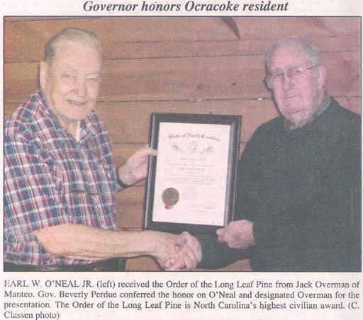 OCRACOKE'S O'NEAL RECEIVES STATE'S HIGHEST CIVILIAN HONOR - Earl W. O'Neal, Jr. of Ocracoke has received the Order of the Long Leaf Pine, North Carolina's highest civilian honor. The award, bestowed by Gov. Beverly Perdue, was presented by Jack Overman, the governor's designee for the occasion, at the Outer Banks Scenic Byway Advisory Committee meeting held December 15. O'Neal, 80, engaged in distinguished military and business careers before retiring to his ancestral home to work on numerous civic, history and genealogy projects. He served 26 years in active and reserve duty in the U.S. Navy and U.S. Army, retiring with the rank of Chief Warrant Officer. His service included tours in Japan and Korea during the Korean Conflict. He was one of the first eight people in the U.S. Army's Nuclear Cadre, an assignment that led to his career as a professional engineer in nuclear power. O'Neal is dedicated to preserving and sharing Outer Banks history and the stories of his family. He is descended from six of the original Ocracoke families. O'Neal always seems to be writing or revising a book. He has authored 17 books on the island's history and early families. He has written about the island's wild ponies, told Ocracoke stories, chronicled family genealogies, and delved into the history of World War II on the island. His love of history called him to serve as a director of the Graveyard of the Atlantic Museum in Hatteras village and as secretary and director of the Outer Banks History Center, where he was named an Honorary Officer. He is a member of eight or more regional historical or genealogical societies. In his drive to share Outer Banks history, O'Neal has worked to deliver 15 Civil War markers on the Outer Banks Civil War Trail. Most recently, he led the effort to erect an island marker for the U.S. Navy Beach Jumpers, who secretly trained on Ocracoke during World War II. O'Neal helped restore and enhance Ocracoke's British Cemetery, designing plaques and monuments therein. He has diligently worked with state and federal agencies to improve pedestrian safety on Ocracoke. His projects include an expanded shoulder along Highway NC 12 around Silver Lake, an almost completed 10-foot wide multi-use pathway connecting Ocracoke village with the National Park Service campground on the island and widening N.C. 12 with paved shoulder to the island's pony pens. He chaired the island's airport advisory board, helping secure a new emergency helicopter pad and championing improvements to the airstrip. The helicopter pad was recently dedicated. O'Neal served as the first chairman on the Outer Banks Scenic Byway Committee on Ocracoke and of the byway's advisory committee, which brings together members from Ocracoke, Down East Carteret, Dare County, as well as partners. The byway recently received national designation. In 2005, O'Neal was recognized with the North Carolina Award for Outstanding Volunteer Service. At the presentation, O'Neal, who was surprised, was feted with a festive breakfast and lunch.