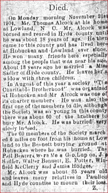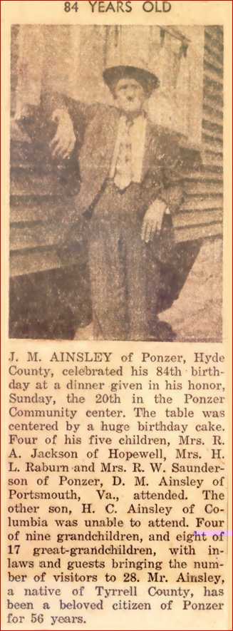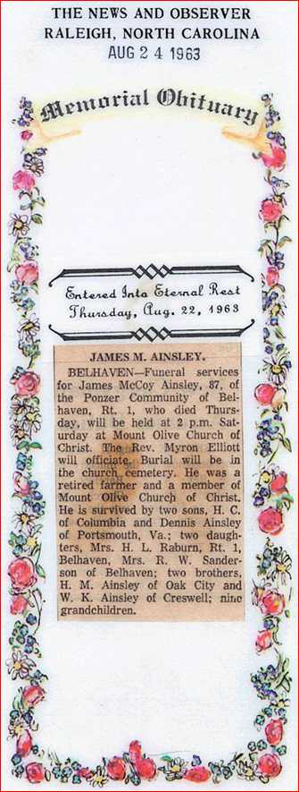 BELHAVEN - Funeral services for James McCoy AINSLEY, 87, of the Ponzer community of Belhaven, who died Thursday [Aug. 22, 1963] will be held at 2 p.m. Saturday at Mount Olive Church of Christ. The Rev. Myron Elliott will officiate. Burial will be in the church cemetery. He was a retired farmer and a member of Mount Olive Church of Christ. He is survived by two sons: H.C. of Columbia and Dennis Ainsley of Portsmouth, Va.; two daughters: Mrs. H.L. Raburn of Belhaven and Mrs. R.W. Sanderson of Belhaven; two brothers: H.M. Ainsley of Oak City and W.K. Ainsley of Creswell; 9 grandchildren. (The News and Observer (Raleigh) - Saturday, August 24, 1963) [birthday celebration article, obituary and memorial card kindly submitted by Judi Raburn, granddaughter of James McCoy Ainsley, who stated that he was predeceased by his wife, Ida Frances Cahoon Ainsley; a daughter, Statha Ainsley Jackson; and a son, Mitchell Ainsley, which was not included in the newspaper obituary. The birthday article was written in about March 1960.]