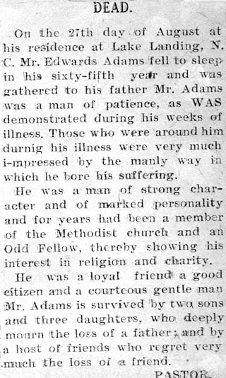 MANTEO - Dallas Bernard ADAMS, 52, died Monday, October 2 in Sentara Norfolk General Hospital. He was the son of Royaton Adams, Sr. and the late Rosa Lee Collins Adams. Surviving besides his father are his wife, Loretta Winslow Adams; a daughter, Portchia Adams of Engelhard; three sisters: Janice Farrow and Ida Murray, both of Engelhard, and Delphine McMurrin of Manteo; and one brother, Royaton Adams, Jr. of Manteo. Graveside services will be 2 p.m. Saturday, October 8 [Saturday was October 7] at Brown Cemetery in Engelhard. The remains will lie in state at Haven Creek Baptist Church in Manteo on Saturday from 11 until 12:30. The procession to leave Manteo to Engelhard for graveside services will follow. Walson Funeral Services is in charge of arrangements. (The Coastland Times - Sunday, October 8, 2000; pg. 14A)