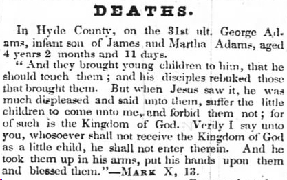 MAKELEYVILLE - Mr. Hugh ADAMS' baby died the 31st of May. (The Washington Gazette - Thursday, June 11, 1896; pg. 2; column 5) [Posted here with kind permission from John H. Oden, III]