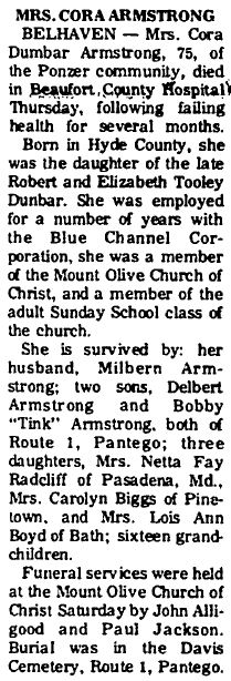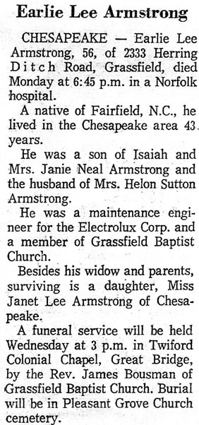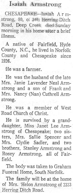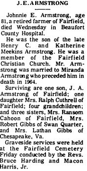 FAIRFIELD - Johnie Albin ARMSTRONG, 76, of Fairfield, died September 1 at Beaufort County Hospital in Washington. A Fairfield native, he was the son of the late Johnie Edward and Miranda Cuthrell Armstrong. He was a retired farmer and a member of Fairfield Lodge #520 AF & AM. Surviving are his wife, Lyda Midyette Armstrong; two sons: Edward E. Armstrong and Frank C. Armstrong, both of Manteo; a sister, Bonnie A. Cutrell of Fairfield; and 2 grandchildren. Funeral services were held Friday at the family plot in Fairfield Cemetery with the Rev. Roger A. Paxton officiating. Bryan Funeral Service in Swan Quarter handled arrangements. (The Coastland Times - Sunday, September 5, 1993; pg. 14A)