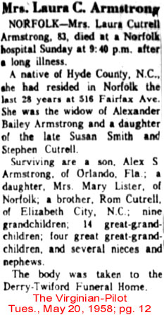 FAIRFIELD - Helen Marie Cutrell ARMSTRONG, 82, died Monday, July 2 at Cross Creek Health Care Center. Born in Hyde County on August 25, 1918, she was the daughter of the late William Riley and Minnie Cutrell. She worked for many years with the Smith family in Belhaven in their guide services and worked with George and Geraldine Bush in the manufacturing of crab pots until she retired. She was a member of the Fairfield Christian Church where she was a former president of the Loyal Women's Society. Surviving are her husband, Martin Dewey Armstrong; three sons: Larry Armstrong of Dayton, Texas, and Jimmy M. and Jerry D. Armstrong of Fairfield; a brother, Delbert Cutrell of Virginia Beach; 12 grandchildren and 18 great-grandchildren. Mrs. Armstrong was preceded in death by brothers: Henry Carroll Cutrell, Willie Earl Cutrell and Rufus Cutrell; and sisters: Elma C. Nixon, Ethel C. Smith and Rosa C. Swindell. Funeral services will be held at 11 a.m. Thursday, July 5, at the family plot in Fairfield Cemetery. William Booth and Steve Bryan will officiate. Arrangements are by Bryan Funeral Service in Swan Quarter. (The Coastland Times - Thursday, July 5, 2001; pg. 10A)