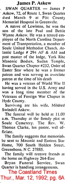 SWAN QUARTER - Mildred Swindell ASKEW, 83, died Saturday, May 27 at Pungo District Hospital in Belhaven. Born in Hyde County on November 24, 1916, she was the daughter of the late Willie Valentine and Annie Etta Benson Swindell, and was the widow of James Askew who died in 1992. She was a member of the Soule United Methodist Church where she was active in United Methodist Women and Ladies' Aide. She was a member of the Order of the Eastern Star, Hyde Chapter 213 and had served as District Deputy Grand Matron of the Second District of the Grand Chapter of North Carolina, Order of the Eastern Star. She received her 50-year pin in recognition of her service in 1998. She was also a member and maintained a genuine interest in the work of the Mattamuskeet Foundation. She worked for many years as secretary at the former O'Neal Oil Company in Swan Quarter. Surviving are several nieces and nephews. She was preceded in death by her brothers: Metrah Swindell, Malcolm Swindell, Murrel Swindell, Marvin Swindell, Maxwell Swindell and Melvin Swindell. The family will receive friends at the home of Mr. & Mrs. R. Arlen Swindell of Swan Quarter. Arrangements by Bryan Funeral Service in Swan Quarter. (The Coastland Times - Tuesday, May 30, 2000; pg. 6B)