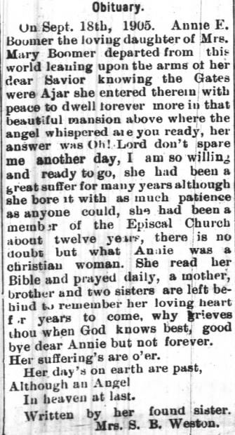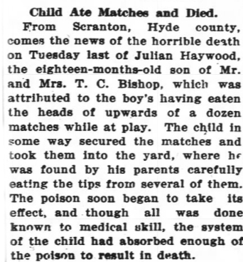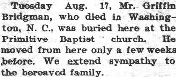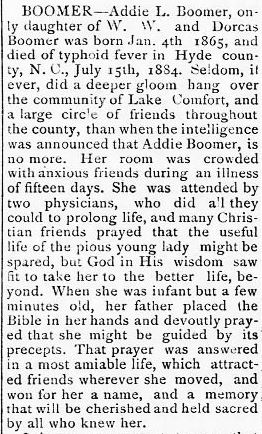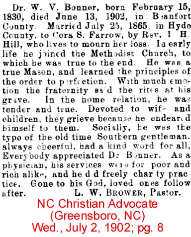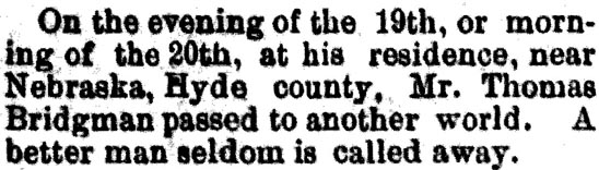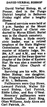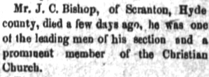 In Memoriam of John C. BISHOP who died August 16th 1896 at his home in Scranton, Hyde County, N.C. (The Washington Gazette - Thursday, September 3, 1896; pg. 2)
