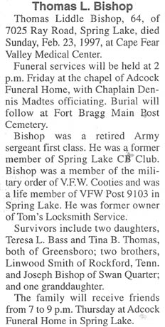 NOTE: Thomas was born in Hyde Co. on Dec. 20, 1932 to Guy Thomas Bishop & Lillian Olivia Boomer. He died in Fayetteville, NC