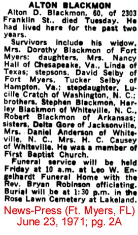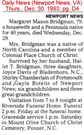 CHESAPEAKE, VA - Hubert G. BLAKE, 77, of Miller Avenue, died December 2 in a hospital. Mr. Blake was born in Fairfield. He was a rigger and had retired from the Norfolk Shipyard in Portsmouth after 21 years. He was a member of Avalon Church of Christ. Survivors include his wife, Elma Blake of Chesapeake; a sister, Addie Holloman of Chesapeake; three brothers: Dave Blake of Grandy, Travis Blake of Gibbs and Melvin Blake of Chesapeake; 5 grandchildren and 8 great-grandchildren. Funeral services were held Friday, December 4, in Holloman-Brown Funeral Home, Indian River Chapel, by Mr. James A. Bennett. Burial was in Forest Lawn Cemetery. (The Coastland Times - Sunday, December 6, 1992)