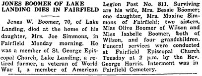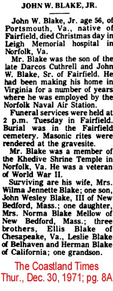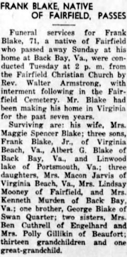 PANTEGO - James Elwood BLAKE, 70, of the Terra Ceia Community, Rt. 2, died June 21 at his home. He was born in Hyde County, the son of the late James Mathias and Elvira Jones Blake. He was married to the former Mamie Jefferson. He was employed as the farm mechanic on the Zeno Radcliff Farms for many years. He was a U.S. Army veteran of World War II and a member of the Second Baptist Church in Washington. Surviving with his wife are two step-sons: David U. Barton of Chesapeake, Va. and Stephen E. Barton of Washington; three sisters: Louise Spencer and Nancy Lee Vaughn, both of Belhaven and Eunice Swindell of Engelhard; 6 step-grandchildren and 2 step-great-grandchildren. Funeral services were held Tuesday in the Paul Funeral Chapel in Washington with Dr. William Massey officiating. Burial was in Pamlico Memorial Gardens. Arrangements were by Paul Funeral Home, Washington. (The Coastland Times - Thursday, June 25, 1992)