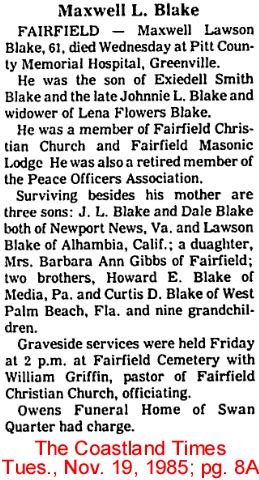 GRANDY - William D. "Dave" BLAKE, SR., 77, of Edgewater Drive, died Thursday, February 10, at his residence. He was a native of Hyde County, the son of the late Charles and Betty Neal Blake and was the husband of Eloise Taylor Blake of the residence. He retired as a government employee after 36 years of service, and also retired as a self-employed plumber in the Portsmouth area. He was a member of Mount Zion United Methodist Church and Lake Drummond Masonic Lodge #178 for approximately 50 years, Currituck Masonic Lodge #463, Scottish Rite, Elizabeth City Shrine Club and Chesapeake Hunt Club. He was a veteran, serving in the U.S. Navy. Besides his wife, Mr. Blake is survived by a daughter, Joyce Strickland and her husband Michael of Chesapeake; a son William D. "Bill" Blake, Jr. and his wife Lou of Moyock; a sister, Addie Creekmore; and a brother, Travis Blake, both of Chesapeake; 7 grandchildren and 14 great-grandchildren. He was preceded in death by five brothers: Carroll, Morgan, Hubert, Ben, and Melvin. A funeral will be conducted at 7 p.m. Thursday in Mount Zion United Methodist Church by the Rev. Glenn McCraine and the Rev. Thomas Tarkenton. A graveside service will be held in the Olive Branch Cemetery in Portsmouth at 11 a.m. on Friday with Masonic rites. Twiford's Memorial Chapel in Elizabeth City is in charge. (The Coastland Times - Thursday, February 12, 1998; pg. 10A)