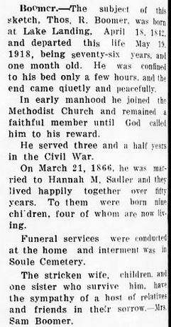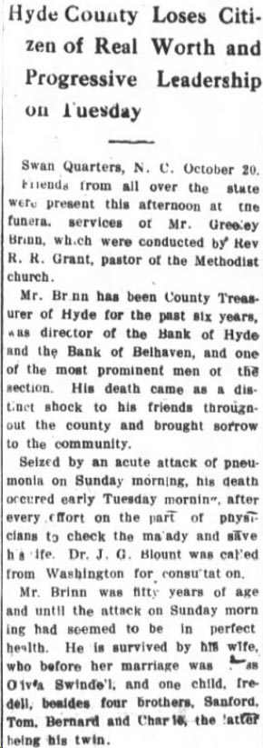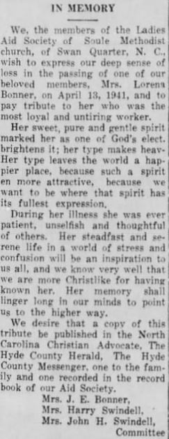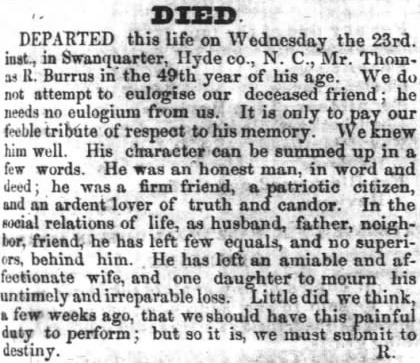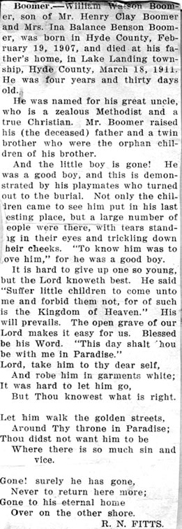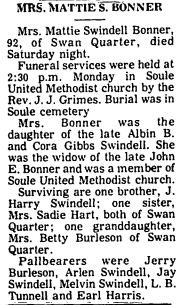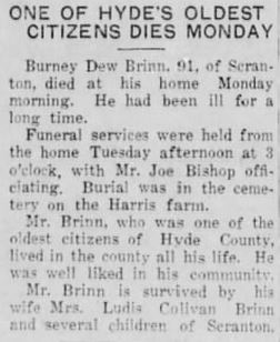 R.E. BURRUS, 76, NATIVE OF HYDE, DIES IN MANNS HARBOR - Robert Everett BURRUS, 76, until two years ago a member of the Dare County Board of Education for many years, died at 4:30 p.m. Sunday at his home in Manns Harbor following a day's severe illness. He had been in declining health for several years. Funeral services were conducted at 2 p.m. Tuesday at Mr. Carmel Methodist Church. The Rev. Tracey Varnum and the Rev. T.G. Grinder conducted the rites. He was born at Middletown, Hyde County, September 20, 1874, the son of Fletcher and Josephine Burrus, and had been a resident of Manns Harbor for 50 years. He had been married three times, losing by death his first two wives, Mrs. Lucetta Mann Burrus and Mrs. Minnie Tillett Burrus. He is survived by his wife, Mrs. Lula Twiford Burrus; three sons: Johnnie, Allen, and Bobby Burrus; one daughter, Carolyn Burrus, all of Manns Harbor; one step-son, Sam Tate of Duck; one step-daughter, Mrs. Melrose Tillett of Manns Harbor; one brother, J.F. Burrus of Elizabeth City; one sister, Mrs. C.T. Tillett of Norfolk. He was a loyal member of Mt. Carmel Methodist Church and was also a member of the Manns Harbor Ruritan Club. He had always been a generous and public-spirited citizen and contributor to all community affairs. He had served his county on both Board of Commissioners and Board of Education, and for many years as local school committeeman. He had spent his lifetime in the fishing business and during his active life was both industrious and prosperous. (The Coastland Times - June 8, 1951; pg. 1)