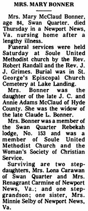 SCRANTON - Margaret Dunbar BING, 94, of Scranton, died Oct. 9 in Cross Creek Health Care Center, Swan Quarter, where she had been a patient for several months. Born in Scranton, she was the daughter of the late William Hertford and Julia Boyd Dunbar. She was the widow of Emmitt I. Bing who died in 1976. Mrs. Bing was a former employee of Virginia Public Service during the years she lived in Virginia and also taught school for several years. She was a member of the Swan Quarter Christian Church. Surviving are a sister, Lucille D. Griffin of Elizabeth City, and several nieces and nephews. Her brothers, Keith Dunbar and Kenneth Dunbar, and sisters, Lillian Hollowell and Allene Credle, preceded her in death. The family is at the home of Mr. and Mrs. Robert K. Dunbar, Route #1, Scranton. Funeral services were held Monday at the family plot in Mt. Olive Church of Christ Cemetery in the Ponzer Community. Mike Caton officiated. Arrangements were by Bryan Funeral Service, Swan Quarter. (The Coastland Times - Tuesday, October 11, 1994)