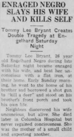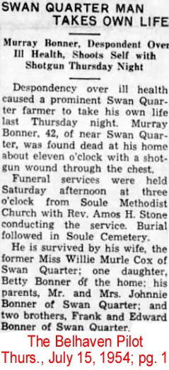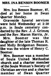 SWAN QUARTER - Bennie BLOUNT, 90, of Cross Creek Health Care Center and formerly of Route 1, Swan Quarter, died Sunday, December 14, at Pungo District Hospital in Belhaven. Funeral arrangements will be announced by Whitfield and Whitley Funeral Home in Washington. The family will receive friends at the home of his daughter, Bessie B. Murray, in Swan Quarter. (The Coastland Times - Thursday, December 18, 1997; pg. 5B)