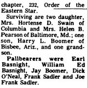 Elizabeth Boomer Basnight Butt, 90, of 21260 U.S. Hwy 264, Swan Quarter died peacefully at her home on Monday, June 28, 2010. Born in Hyde County, March 21, 1920, she was the daughter of the late Caleb S. and Rosalind Swindell Boomer. She was married to Douglas M. Butt who survives. She was a member of Soule United Methodist Church, and Soule United Methodist Women. She was a homemaker and was a member of the Order of the Eastern Star Fairfield Chapter #247. She previously worked several years in the tax department for the County of Hyde. Mrs. Butt was an avid basket maker, loved to press flowers and enjoyed working in her garden. Funeral Services will be held at the graveside in Soule Cemetery on Wednesday at 11:00 a.m. Pastor Jerald Craddock will officiate. In addition to her husband, surviving are four sons, William E. Basnight of Swan Quarter, Floyd B. Butt of Fairfield, John D. Butt of Mesa, AZ, David W. Butt of Charlotte, NC.; three daughters Marilynne J. Johnson of Durham, Jo Anne DiCessare of Greenville and Rebecca Jenkins of Benna VA; one brother Samuel Jay Boomer of Swan Quarter; one grandson Eddie G. Basnight of Swan Quarter; one great-granddaughter Laura E. Basnight. The family will receive friends on Tuesday, 6 p.m. to 8 p.m. at Bryan Funeral Service, Swan Quarter and other times at the home. (Bryan Funeral Service)