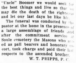 Oscar M. BURRUS, 69, of Ocracoke, died Thursday of last week in Hatteras after a short illness. He was a native and lifelong resident of Ocracoke, son of the late Joseph M. and Mrs. Eleanor Oden Burrus. He was retired from the U.S. Corps of Engineers, a member of Hatteras Masonic Lodge, a member of the Scottish Rites and Sudan Temple in New Bern and a member of the Ocracoke Lodge U.D. and a member of the Methodist Church. He is survived by one daughter, Mrs. Alta Vanlandingham of Ocracoke; one son, Merritt Burrus of Greenville; six sisters: Mrs. Herman Spencer and Mrs. Monford Garrish of Ocracoke, Mrs. Raymond Beasley and Mrs. Henry Wilder of Norfolk, Mrs. T.L. Thorpe of California, and Mrs. Victor Griggs of Portsmouth. Funeral services were conducted Sunday at 1 p.m. in Ocracoke Methodist Church. Burial was in the Community Cemetery with Masonic rites at the grave by Cape Hatteras Lodge. (Unknown newspaper - January 1971) [Note: Oscar Merritt Burrus died January 14, 1971.]