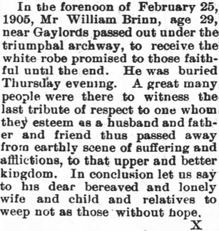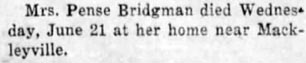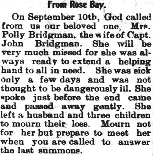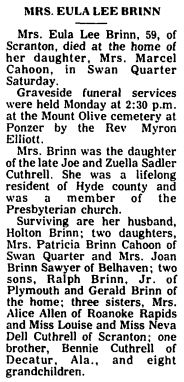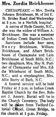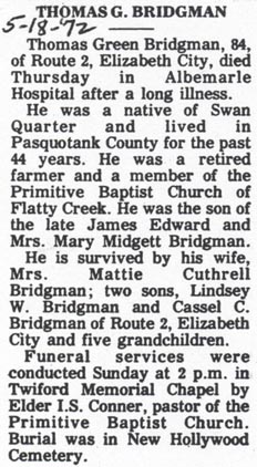 Mrs. Eleanor Oden BURRUS, 83, a native of Hatteras and a resident of Ocracoke for the past several years, died Friday morning at 2:29 at the home following a long illness. She was the daughter of the late S.S. and Martha Jane O'Neal Oden and a member of Ocracoke Methodist Church. She is survived by six daughters: Mrs. Herman Spencer and Mrs. Monford Garrish of Ocracoke, Mrs. Raymond Beasley and Mrs. Victor D. Grigas of Portsmouth, Mrs. Henry Wilder of Norfolk and Mrs. T.L. Thorpe of Placentia, California; one son, Oscar Burrus of Ocracoke; five sisters: Mrs. Brittie Gaskill, Mrs. A.M. Austin, Mrs. Isabelle Ballance and Mrs. Millie Peele, all of Hatteras, and Mrs. Glen Comer of Dobson; two brothers: Dan Oden of Hatteras and J.T. Oden of Grifton, Georgia; 15 grandchildren and 26 great-grandchildren. Funeral services were conducted Sunday afternoon at 2 p.m. at Ocracoke Methodist Church by the Rev. Tom Boggs, pastor. Burial was in the Community Cemetery. (Unknown newspaper - November 1964) [Note: Eleanor Bridgman Oden Burrus died November 20, 1964]