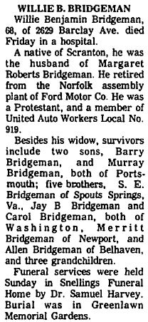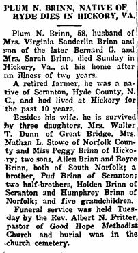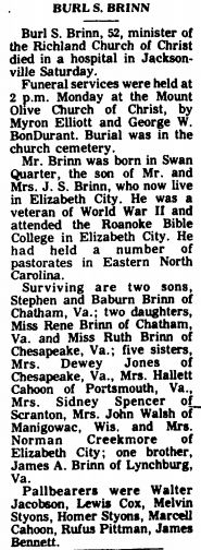 PORTSMOUTH - Andrew Jefferson BURRUS, of 907 Ellington Square, a native of Fairfield, N.C., and the husband of Mrs. Annie M. Burrus, died Saturday in Portsmouth Naval Hospital. He was a son of Mrs. Emily Harris Burrus. He was a retired 20-year Air Force veteran and a member of International Longshoreman's Association, Local #1248, and Snow Hill Baptist Church in Fairfield. Other survivors include a daughter, Mrs. Clarithia Bowe of Cheasapeke; four sisters, Mrs. Edna Riddick of Elizabeth City, N.C., Mrs. Jeanie Roberts of Florida, and Mrs. Agnes Cooper and Mrs. Sandra Gaylord of Norfolk; seven brothers: James H. Burrus of Fairfield, Matthew Burrus of Norfolk, Frank Burrus, Marshall Burrus and Enoch Burrus of Elizabeth City, Dale M. Burrus of New Jersey, and Roy Burrus of Spring Valley, N.Y.; and 4 grandchildren. A funeral will be held Thursday at 2 p.m. in Moint Olive Missionary Baptist Church in Middlesex, N.C. by the Rev. Mr. Horton. Burial with military honors will be in Community Cemetery in Middlesex with Graves Funeral Home in Norfolk in charge. (Unknown newspaper with no date) [Note: Social Security Death Index indicates Andrew J. Burrus died in Portsmouth in September 1979.]